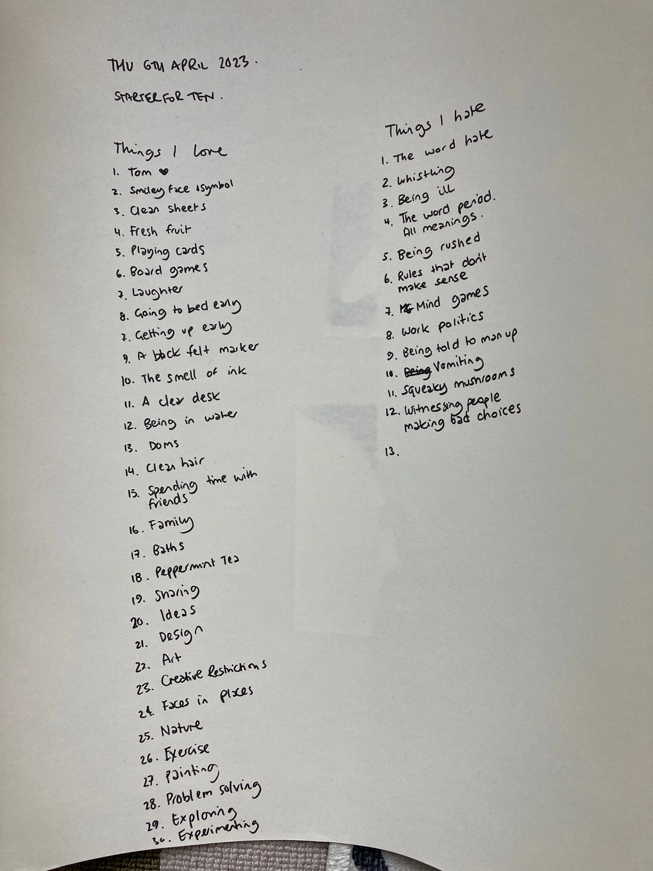 Inspired by the list at the back of Aaron James Draplin’s book Pretty Much Everything that I had been reading the night before I decided to brain dump what I love and hate to see if it would give me any ideas for what to draw next. I was surprised my love list was longer than the hate one, a nice start to the day.