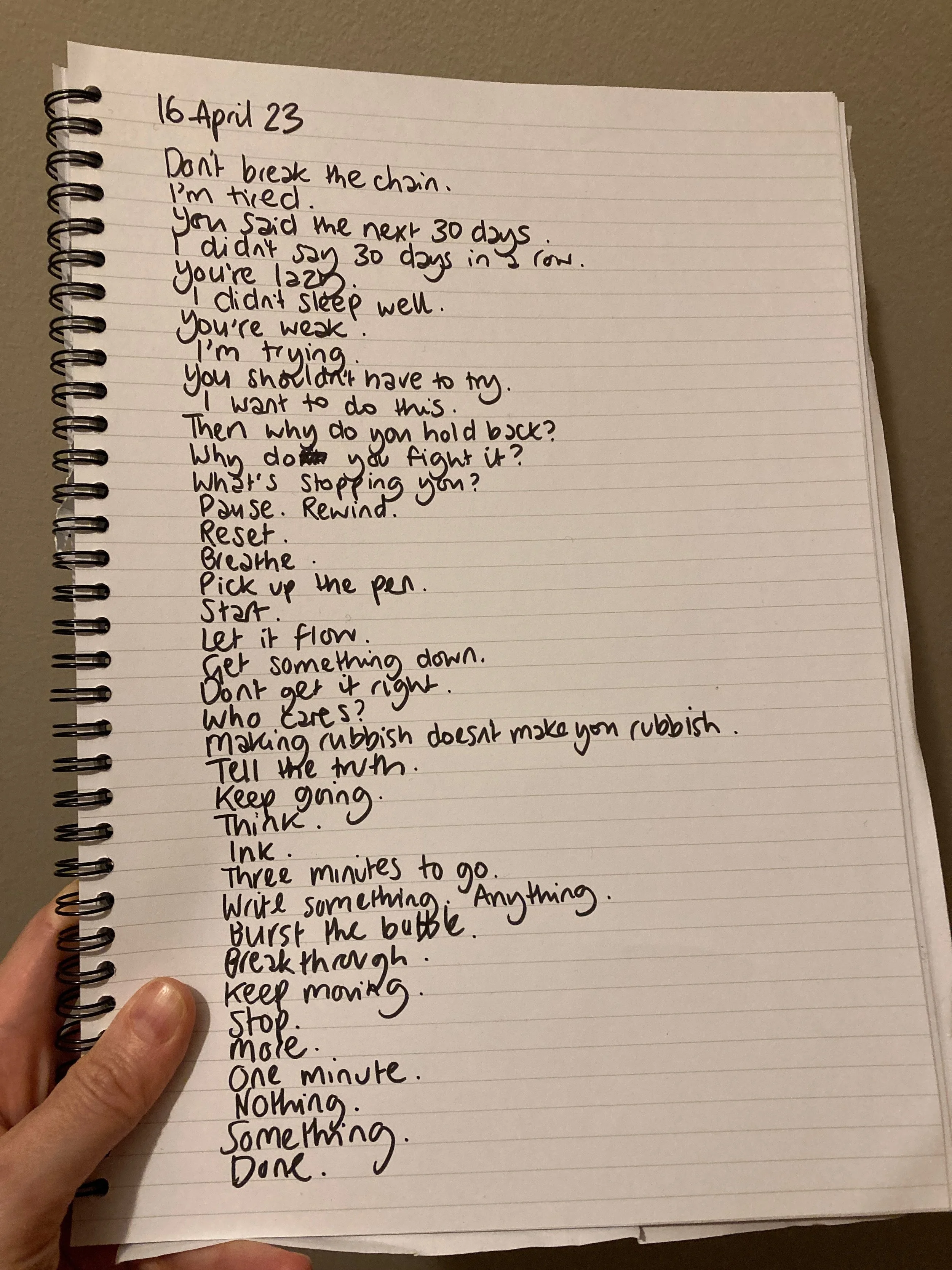 I have a confession, I just couldn’t make the challenge a priority today. Instead I went to the park to train, enjoyed a 3 hour walk in nature with a friend, played sudoko for an hour, basically did everything I could to trick myself into thinking it was ok not to write or create. It got to 9pm and I suddenly thought future Yo is going to be annoyed, just do something, anything!
