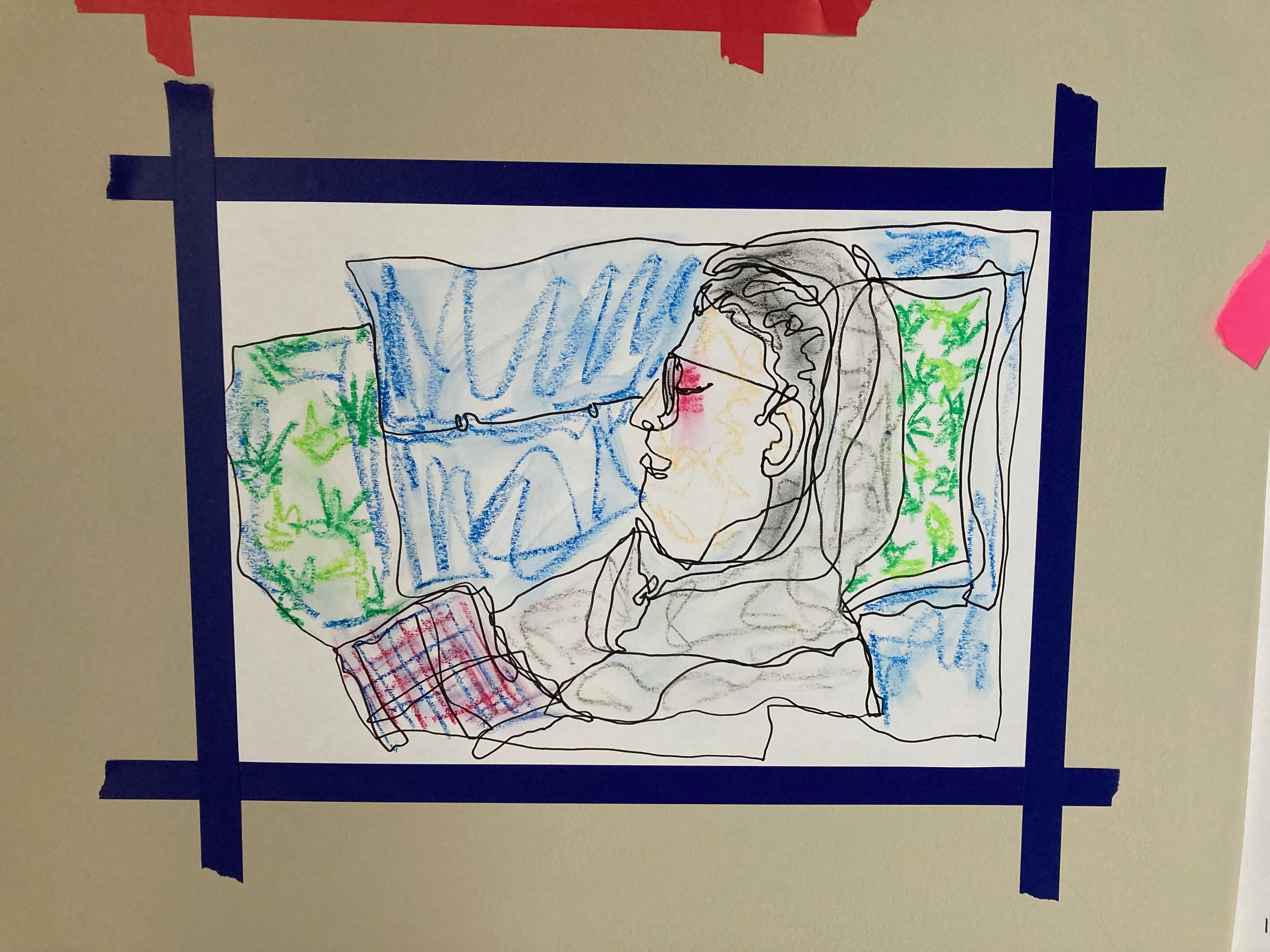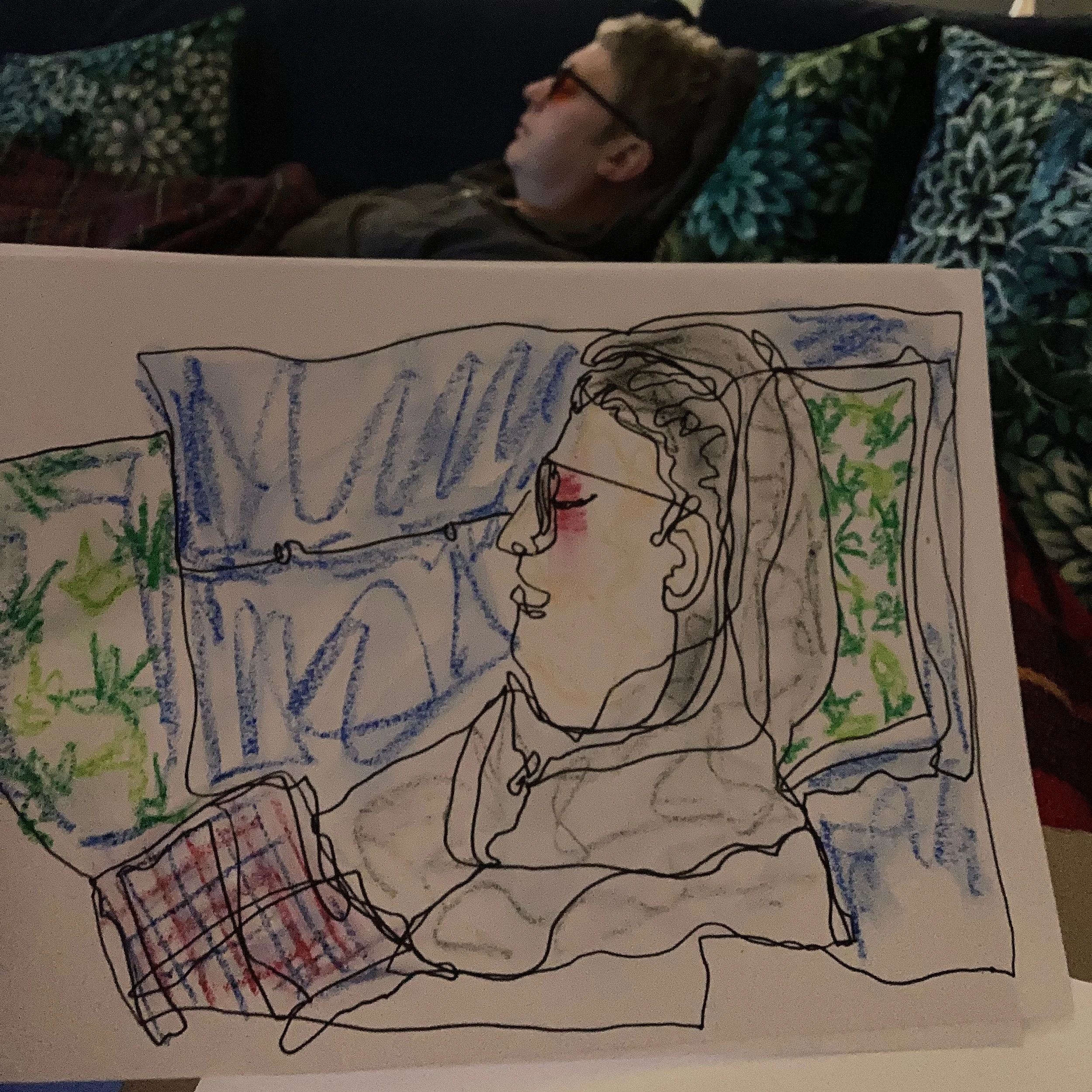 To make life easy I decided to sketch what was in front of me. I couldn’t quite tell if my husband was watching the documentary on tv or if he was asleep. Either way he didn’t move at all which was useful. I did the drawing in one continous line without lifting the pen from the paper, it looked better in just black and white but I forgot to take a photo of it at that stage. I like that it doesn’t look perfect.