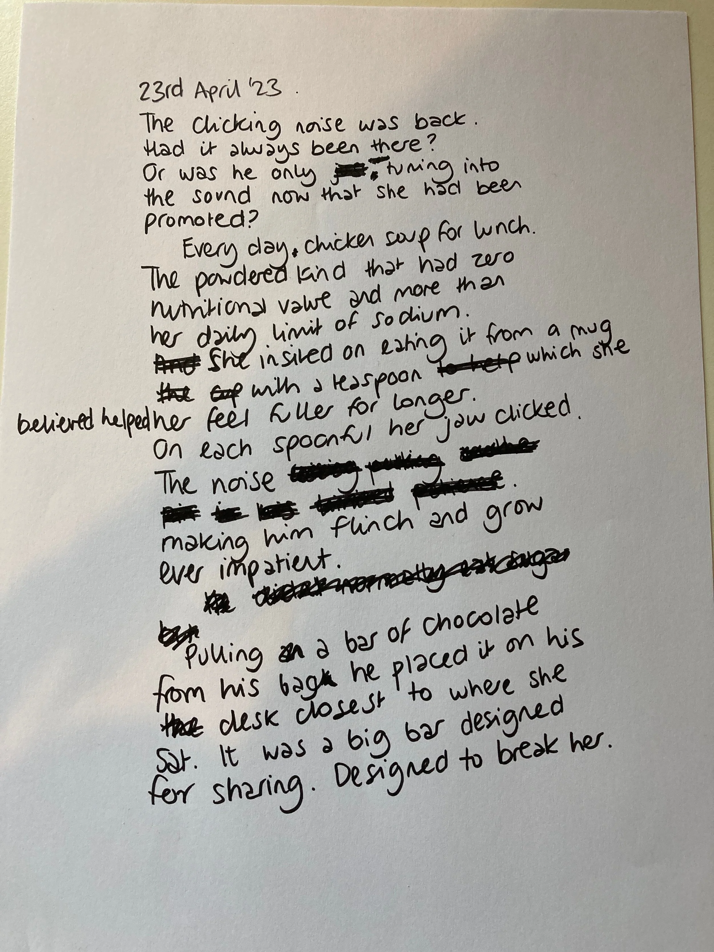 Shan knows I love a prompt card and sent me a set from The School of Life for self-exploration. The card I chose from random today asked me to think of three things that annoy me about someone close to me. This inspired today’s story, for the record this is fictional, if anyone I love has a jaw that clicks or loves chicken cup-a-soup it doesn’t annoy me.