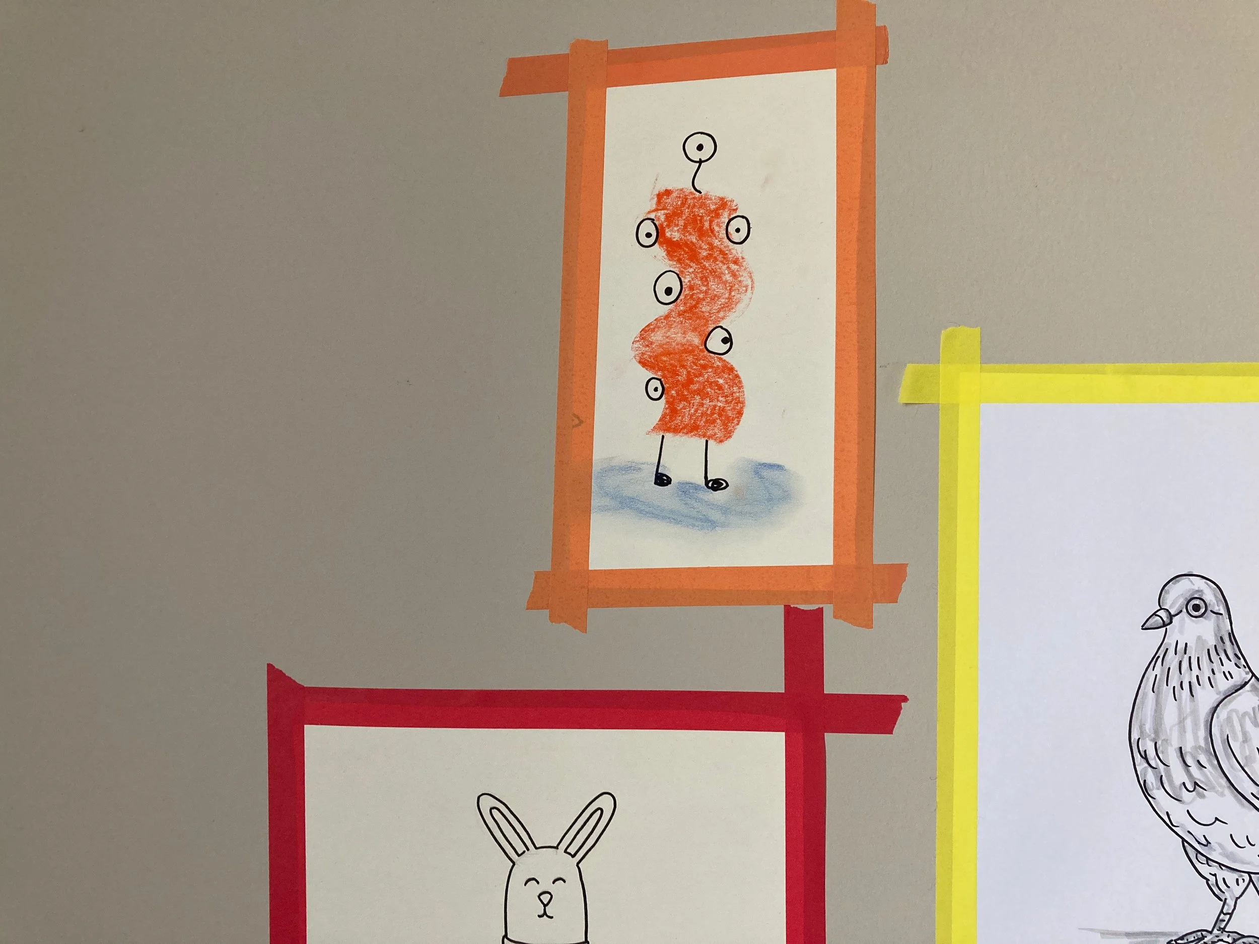 The orange guy tickled me so he made the wall. I have just realised that my wall is my own version of Tony Hart’s gallery on Hartbeat, I’m showing my age now.