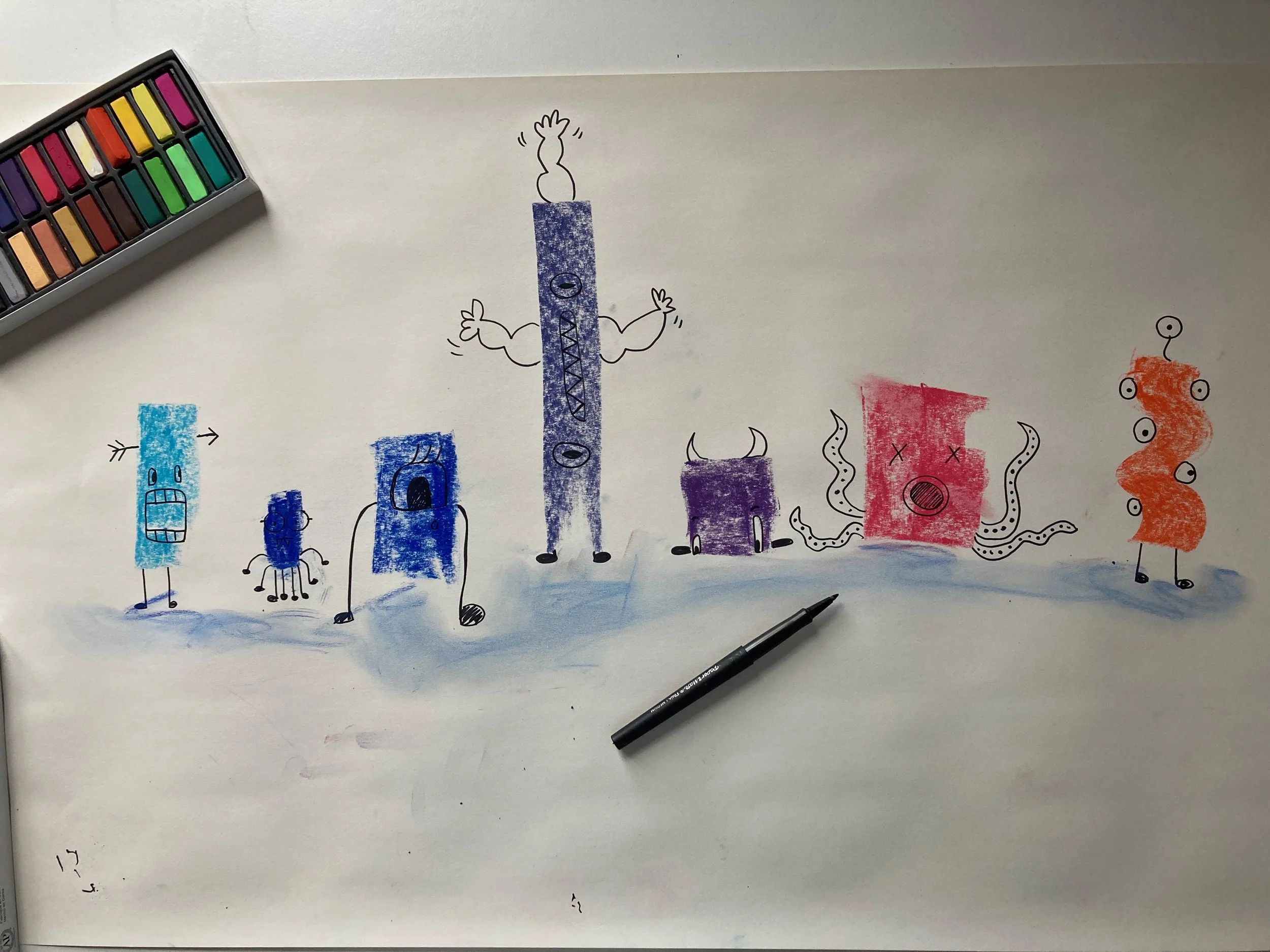 The writing exercise made me think of monsters. I used pastels to make some shapes and then a black felt tip to create doodle monsters.