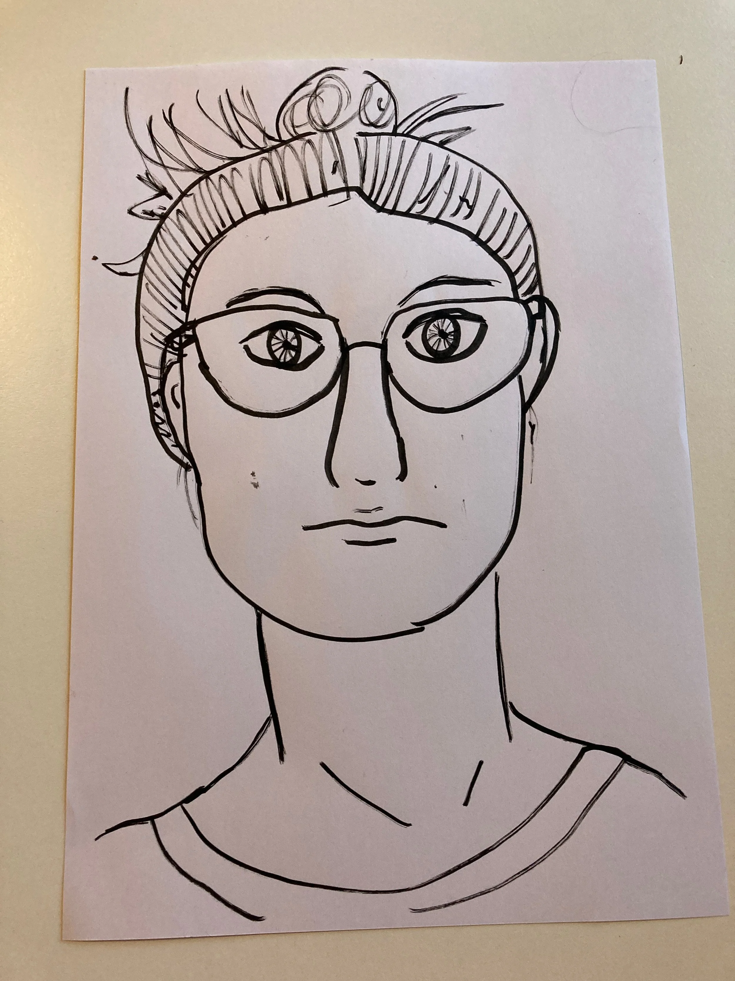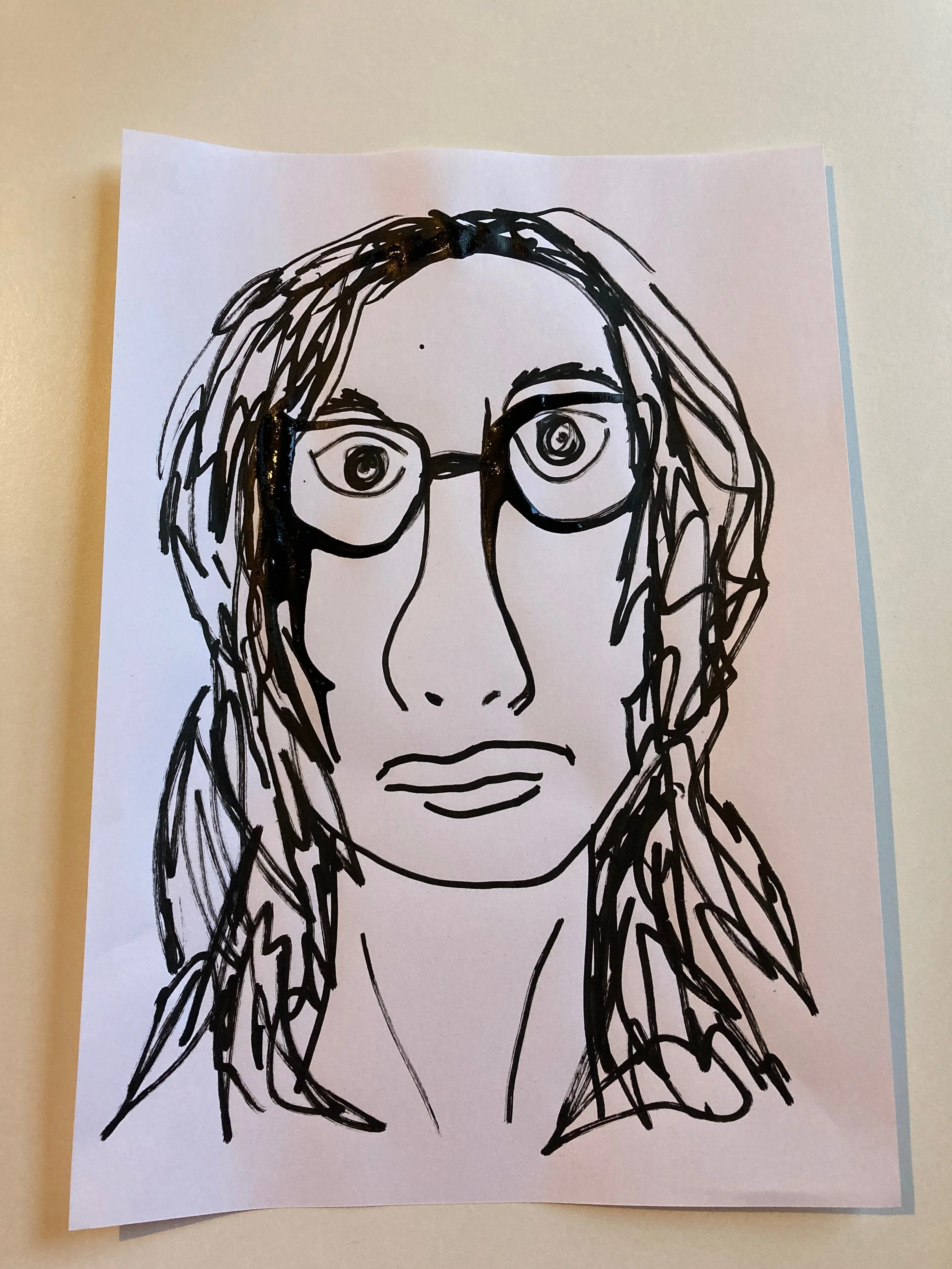 Something weird happened when drawing the second sketch the pen bled a bit which I went with. I decided to over exaggerate the nose and once I did that I decided to just do whatever the pen wanted. Everything is in the wrong place but I like that it looks messy and manic.