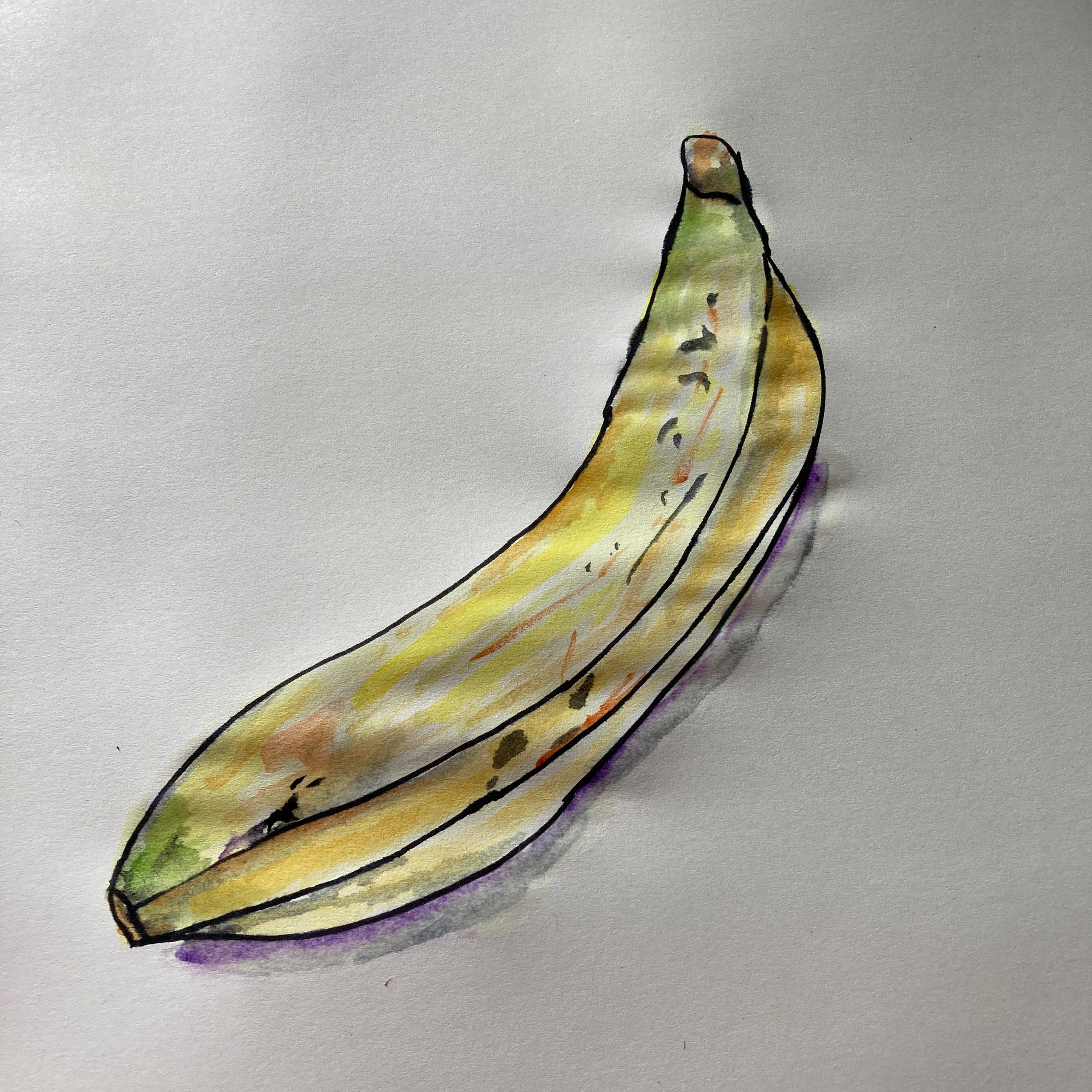 Thinking about the way I think made me think of bananas, so I grabbed one and did my best to paint it by the ten-minute deadline. I don’t really know what I’m doing with watercolours but did my best. I enjoyed painting and will do some research on how to use them properly.