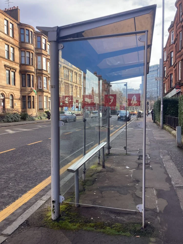 65 - Red graphics - I have never noticed that bus stops in Glasgow feature icons from the city crest, a bird, a bell, a fish, and a tree.