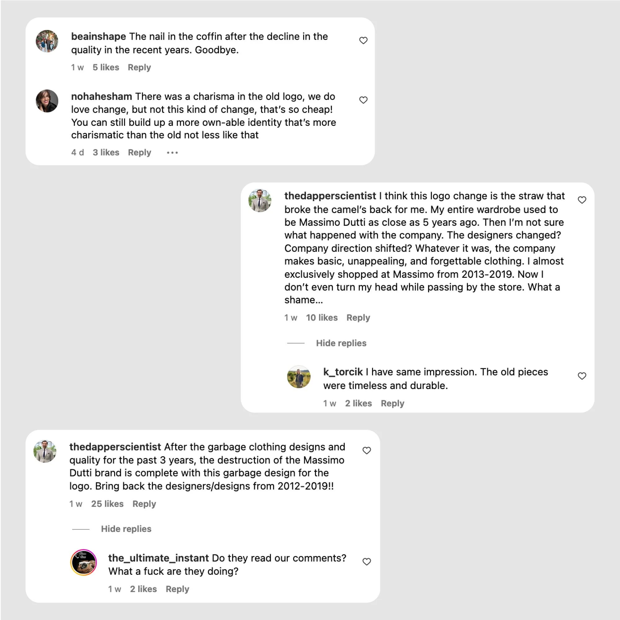 Customers making comments on Massimo Dutti’s Instagram post in reaction to the new logo
